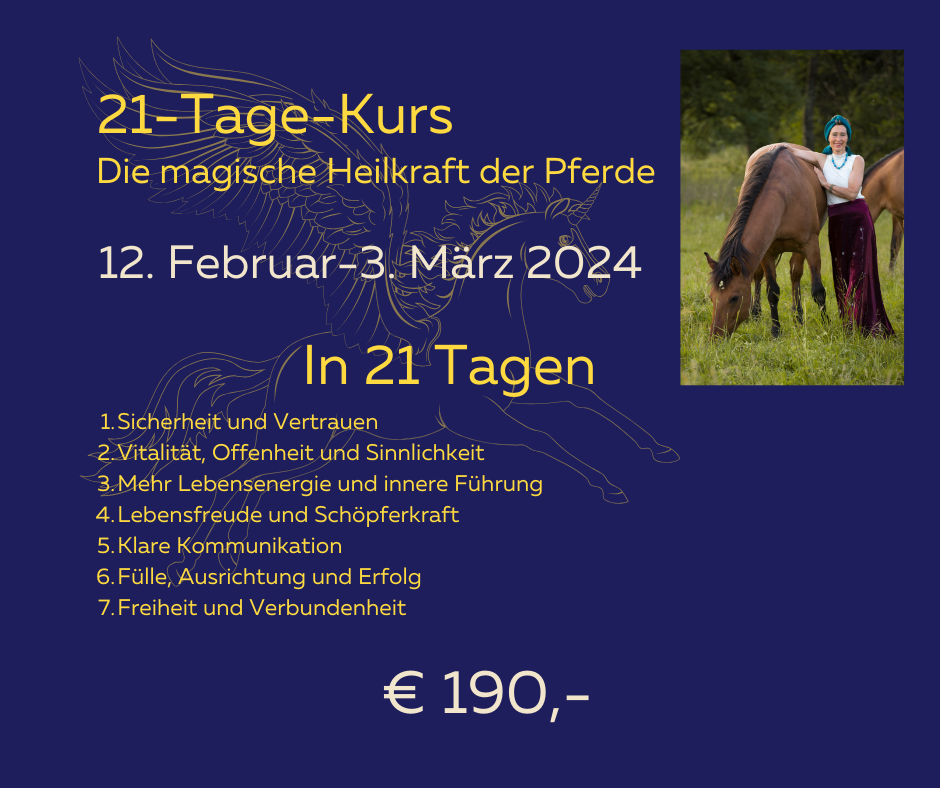 Die Kunst, authentisch die innere Wahrheit zu leben und sich selbst zu lieben, bildet die Grundlage für eine gelingende, liebevolle Beziehung zu unseren Tieren und allem Leben um uns herum. In den nächsten 21 Tagen laden wir dich zu einer magischen Reise ein – eine Erkundung des Neulands der Pferdebotschaften in unserer heutigen Zeit.